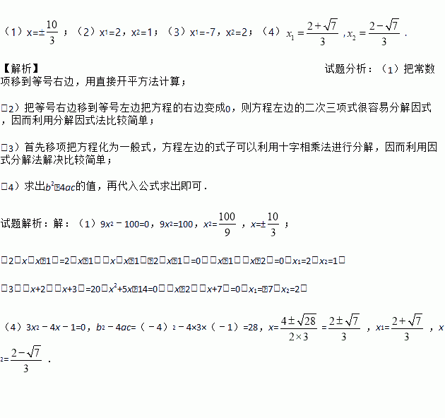 (1)x=?;(2)x1=2,x2=1;(3)x1=-7,x2=2;(4),. 【解析】试题分析:(1)把常数项移到等号右边,用直接开平方法计算; (2)把等号右边移到等号左边把方程的右边变成0,则方程左边的二次三项式很容易分解因式,因而利用分解因式法比较简单; (3)首先移项把方程化为一般式,方程左边的式子可以利用十字相乘法进行分解,因而利用因式分解法解决比较简单; (4...