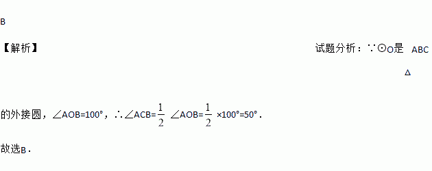 如图,⊙O是△ABC的外接圆,若∠AOB=100°,则∠ACB的度数是( )