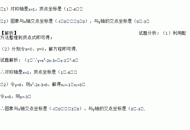 (1)对称轴是x=1,顶点坐标是(1,-4); (2)图象与x轴交点坐标是(-l,0)、(3,0),与y轴的交点坐标是(0,-3) 【解析】试题分析:(1)利用配方法整理到顶点式即可得; (2)分别令x=0、y=0,解方程即可得. 试题解析:(1)∵y=x2-2x-3=(x-1)2-4, ∴对称轴是x=1,顶点坐标是(1,-4); (2)令y=0,则x2-2x-...