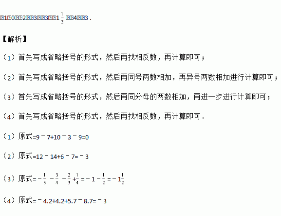 (4)﹣4.2+5.7+(﹣8.7)+4.2.