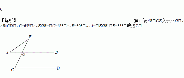 如图,已知 AB∥CD,∠C=65°,∠E=30°,则∠A 的度数是( )