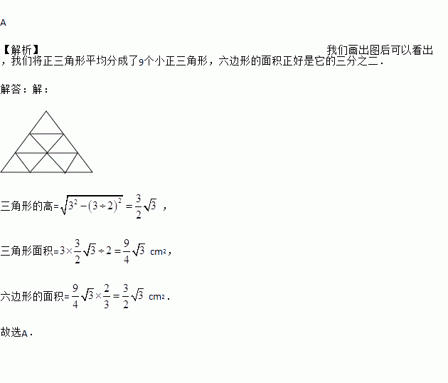 将边长为3cm的正三角形各边三等分,以这6个分点为顶点构成一个正六边形,则这个正六边形的面积为( )
