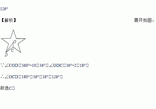 如图,一张矩形纸片沿AB对折,以AB中点O为顶点将平角五等分,并沿五等分的折线折叠,再沿CD剪开,使展开后为正五角星(正五边形对角线所构成的图形),则∠OCD等于_________.
