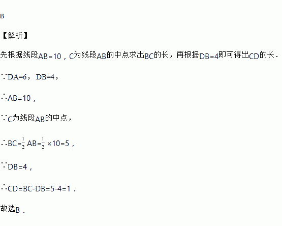 如图,若 C为线段 AB的中点, D在线段 CB上, DA=6, DB=4,则 CD的长度是( )