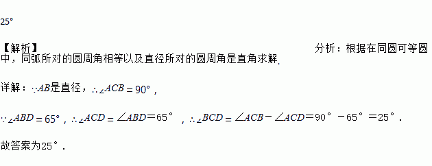 如图,已知AB是⊙O的直径,CD是⊙O的弦,∠ABD=65°,则∠BCD=_____.