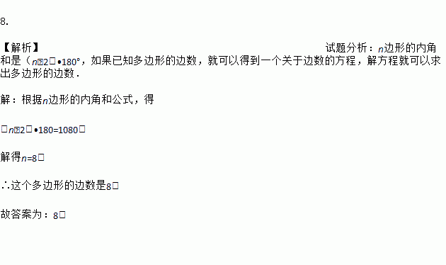 已知一个多边形的内角和为1080°,则这个多边形的边数为 .
