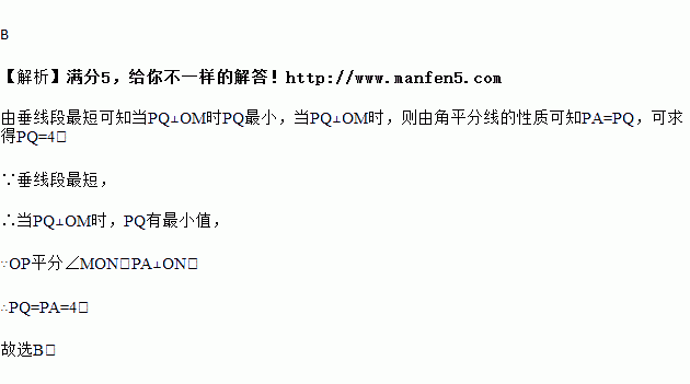 如图,OP平分∠MON,PA⊥ON于点A,点Q是射线OM上的一个动点,若PA=4,则PQ的最小值为( )