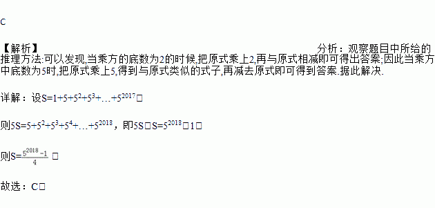 求1+2+22+23…+22012的值,可令S=1+2+22+23+…+22012,则2S=2+22+23+24+…+22013,因此2S﹣S=22013﹣1,仿照以上推理,计算出1+5+52+53+…+52017的值为( )