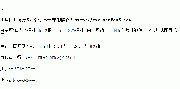 如图是正方体的表面展开图,把展开图折叠成正方体后,与a相对的面上的数比a大2,与b相对的面上的数和b互为相反数,与c相对的面上的数和c互为倒数,求a+b+c的值.