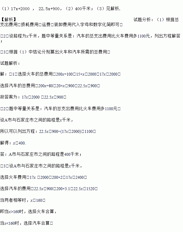 (1)设A市与石家庄之间的路程为x千米,则火车运输的总支出费用是