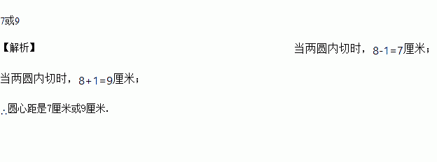 两个圆相切,若两个圆的半径分别为8厘米和1厘米,则圆心距是_________。
