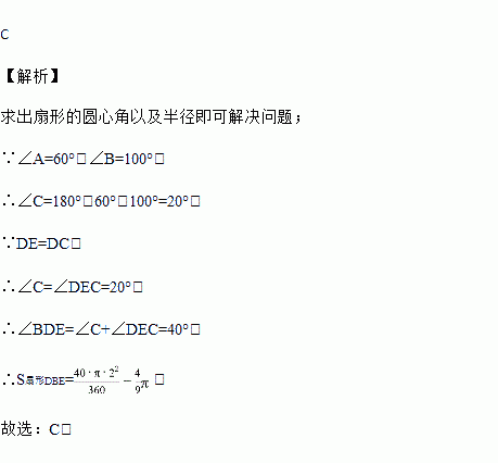 如图,△ABC中,D为BC的中点,以D为圆心,BD长为半径画一弧交AC于E点,若∠A=60°,∠B=100°,BC=4,则扇形BDE的面积为何?( )