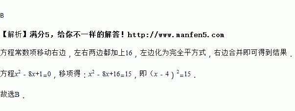 A. (x+4)2=15 B. (x-4)2=15 C. (x-4)2=17 D. (x-4)2=3