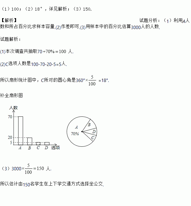 (3)若该中学共有学生3000人,估计有多少学生在上下学交通方式中选择坐公交车?