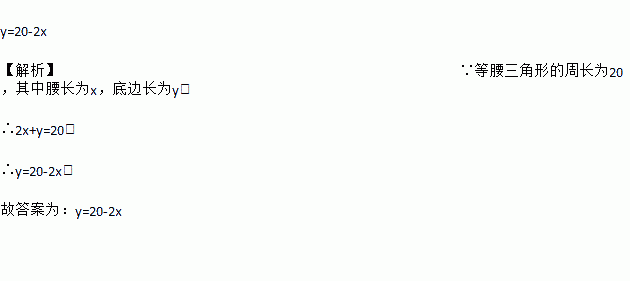 y=20-2x 【解析】∵等腰三角形的周长为20,其中腰长为x,底边长为y, ∴2x+y=20, ∴y=20-2x, 故答案为:y=20-2x