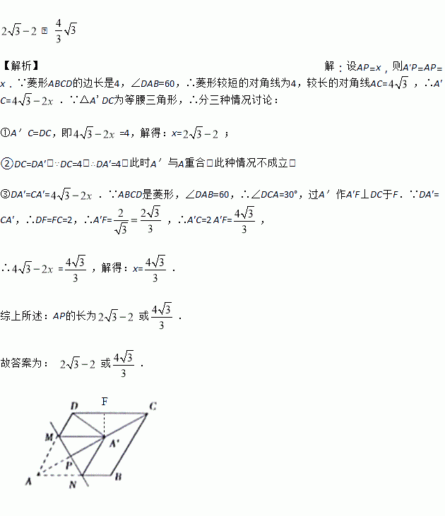 菱形ABCD的边长是4,∠DAB=60,点M,N分别在边AD,AB上,MN⊥AC,垂足为P,把△AMN沿MN折叠得到△A'MN,若△A'DC恰为等腰三角形,则AP的长为_____。