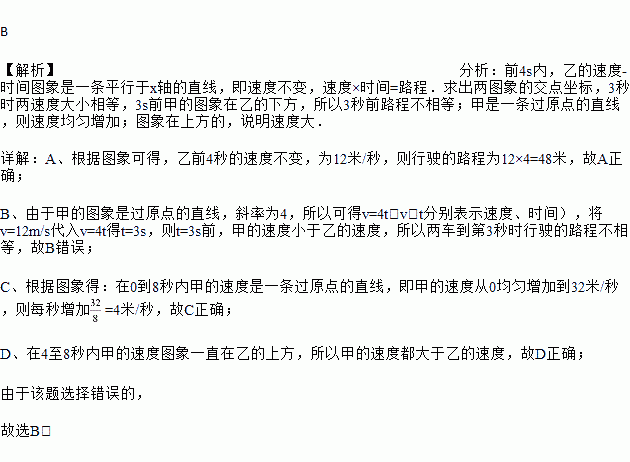 C. 在0到8秒内甲的速度每秒增加4米/秒 D. 在4至8秒内甲的速度都大于乙的速度