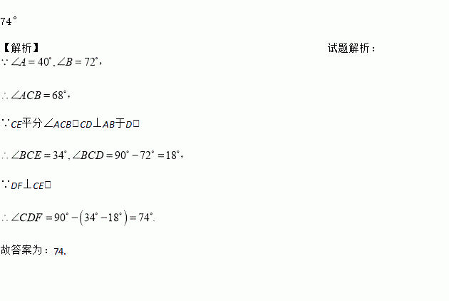 如图,△ABC中,∠A=40°,∠B=72°,CE平分∠ACB,CD⊥AB于D,DF⊥CE,则∠CDF=__度.