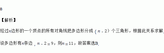 过多边形的一个顶点的所有对角线把多边形分成9个三角形,这个多边形的边数是 ( )