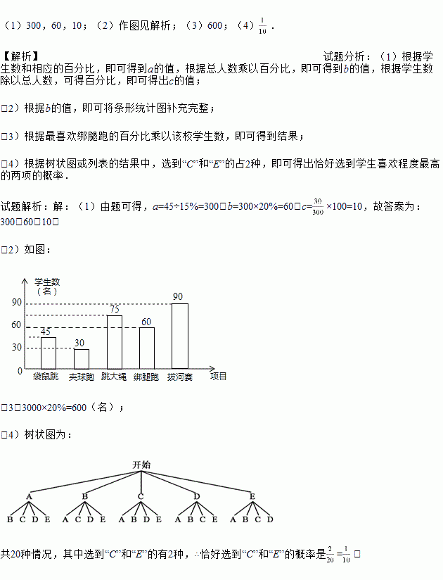 (4)根据调查结果,某班决定从这五项(袋鼠跳、夹球跑、跳大绳、绑腿跑和拔河赛可分别记为A、B、C、D、E)中任选其中两项进行训练,用画树状图或列表的方法求恰好选到学生喜欢程度最高的两项的概率.