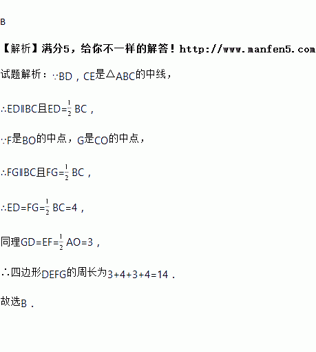 如图,△ABC的中线BD、CE交于点O,连接OA,点G、F分别为OC、OB的中点,BC=8,AO=6,则四边形DEFG的周长为( )