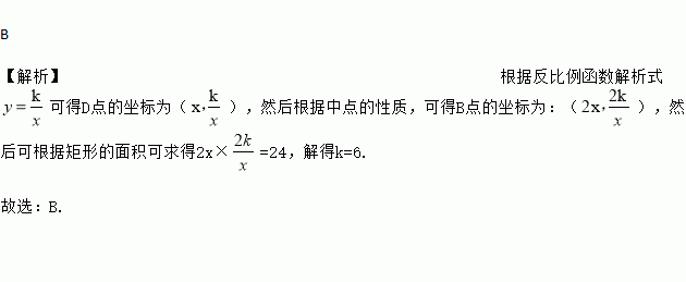B 【解析】根据反比例函数解析式可得D点的坐标为(),然后根据中点的性质,可得B点的坐标为:(),然后可根据矩形的面积可求得2x×=24,解得k=6. 故选:B.