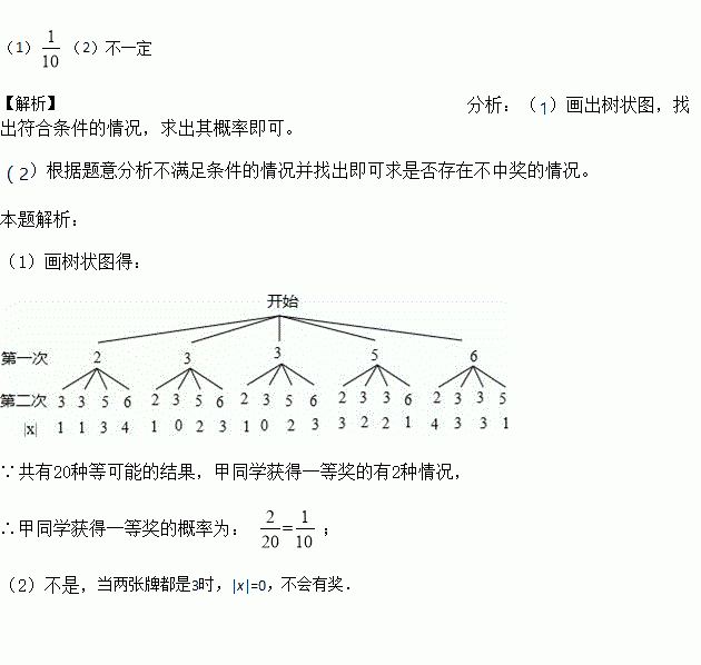 ¾Å£¨1£©°à×éÖ¯°à¼¶Áª»¶»á£¬×îºó½øÈë³é½±»·½Ú£¬Ã¿Ãûͬѧ¶¼ÓÐÒ»´Î³é½±»ú»á£¬³é½±·½°¸ÈçÏ£º½«Ò»¸±ÆË¿ËÅÆÖеãÊýΪ¡°2¡±£¬¡°3¡±£¬¡°3¡±£¬¡°5¡±£¬¡°6¡±µÄÎåÕÅÅÆ±³Ã泯ÉÏÏ´ÔÈ£¬ÏÈ´ÓÖгé³ö1ÕÅÅÆ£¬ÔÙ´ÓÓàϵÄ4ÕÅÅÆÖгé³ö1ÕÅÅÆ£¬¼Ç¼Á½ÕÅÅÆµãÊýºó·Å»Ø£¬Íê³ÉÒ»´Î³é½±£¬¼Çÿ´Î³é³öÁ½ÕÅÅÆµãÊýÖ®²îΪ