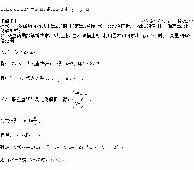 如图,在平面直角坐标系中,直线y1=x+1与双曲线(k>0)相交于点A、B,已知点A坐标(2,m).