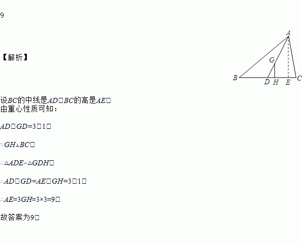 如图,点G是△ABC的重心,GH⊥BC,垂足为点H,若GH=3,则点A到BC的距离为__.