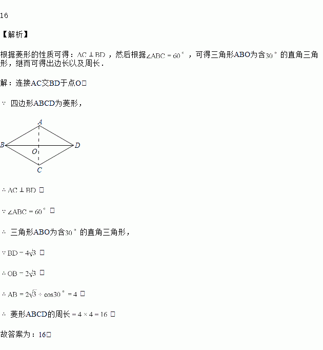 如图,在菱形ABCD中,,,则菱形ABCD的周长等于______.