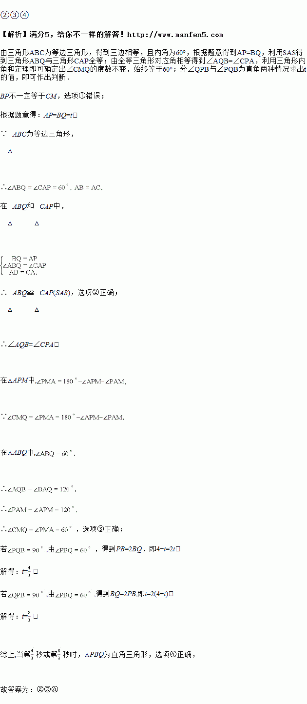 如图,点P,Q分别是边长为4 cm的等边三角形ABC边AB,BC上的动点,点P从顶点A,点Q从顶点B同时出发,且它们的速度都为1 cm/s,连接AQ,CP,相交于点M.下面四个结论正确的有________(填序号).①BP=CM; ②△ABQ ≌△CAP ;③∠CMQ的度数不变,始终等于60º;④当第