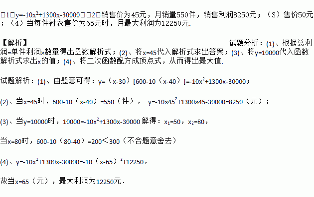 (1)y=-10x2+1300x-30000;(2)销售价为45元,月销量550件,销售利润8250元;(3)售价50元;(4)当每件衬衣售价为65元时,月最大利润为12250元. 【解析】试题分析:(1)、根据总利润=单件利润×数量得出函数解析式;(2)、将x=45代入解析式求出答案;(3)、将y=10000代入函数解析式求出x的值;(4)、将二次函数配方成顶点式,从而得出最大值. ...