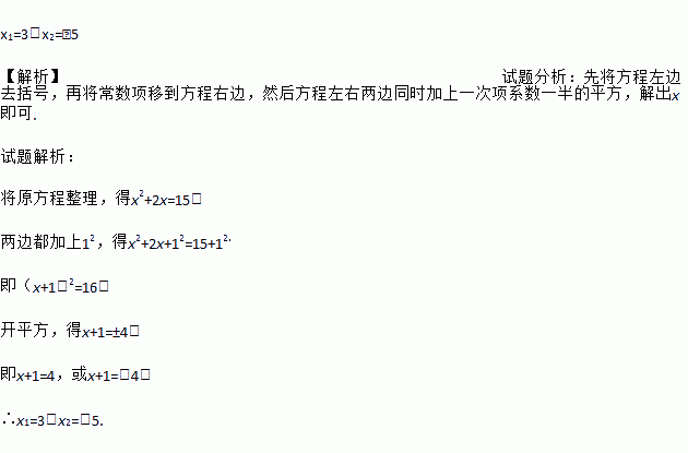 x1=3,x2=﹣5 【解析】试题分析:先将方程左边去括号,再将常数项移到方程右边,然后方程左右两边同时加上一次项系数一半的平方,解出x即可. 试题解析: 将原方程整理,得x2+2x=15, 两边都加上12,得x2+2x+12=15+12, 即(x+1)2=16, 开平方,得x+1=±4, 即x+1=4,或x+1=-4, ∴x1=3,x2=-5.