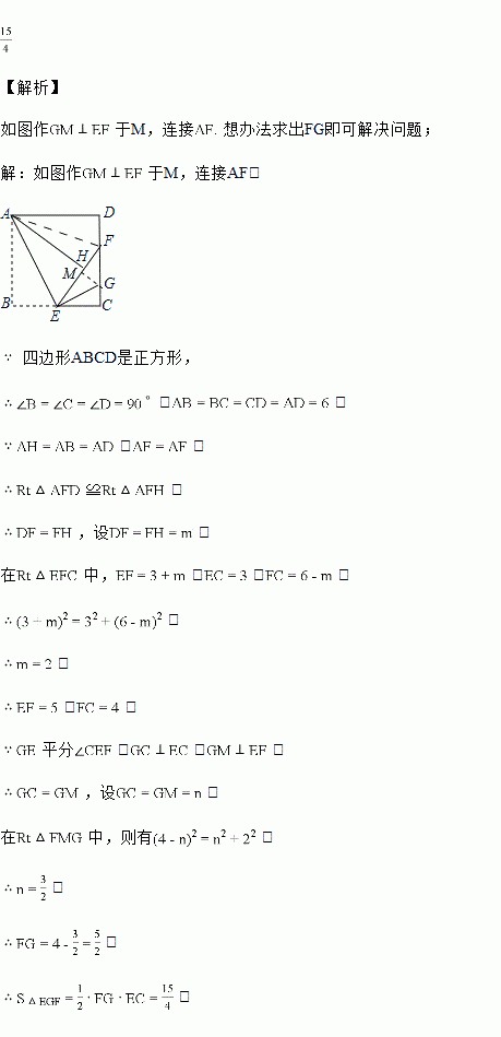 如图,正方形ABCD边长为6,E是BC的中点,将沿AE折叠,使点B落在点H处,延长EH交CD于点F,过E作的平分线交CD于点G,则的面积为______.