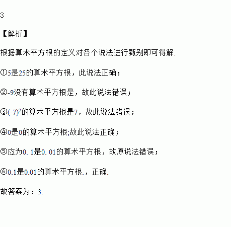 ①5是25的算术平方根;②-9的算术平方根是-3;③(-7)2的算术平方根是±7;④0是0的算术平方根;⑤0.01是0.1的算术平方根;⑥0.1是0.01的算术平方根.