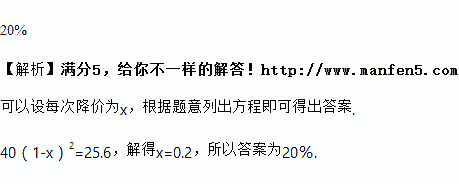 某种药原来每瓶售价为40元,经过两次降价,现在每瓶售价为25.6元,则平均每次降价的百分率是_____________.