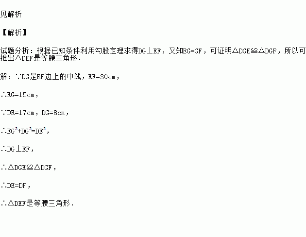 如图,已知△DEF中,DE=17cm,EF=30cm,EF边上的中线DG=8cm.