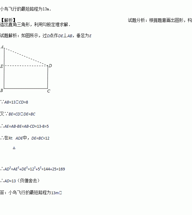 如图,有一只小鸟从小树顶飞到大树顶上,请问它飞行的最短路程是多少米?(先画出示意图,然后再求解).