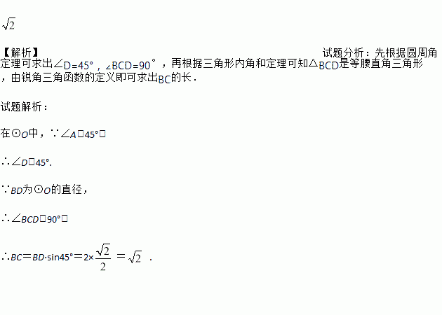 如图,⊙O是△ABC的外接圆,∠A=45°,BD是直径,BD=2,连接CD,求BC的长.