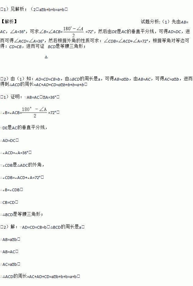 (1)见解析;(2)a﹣b+b+b=a+b. 【解析】试题分析:(1)先由AB=AC,∠A=36°,可求∠B=∠ACB==72°,然后由DE是AC的垂直平分线,可得AD=DC,进而可得∠ACD=∠A=36°,然后根据外角的性质可求:∠CDB=∠ACD+∠A=72°,根据等角对等边可得:CD=CB,进而可证△BCD是等腰三角形; (2)由(1)知:AD=CD=CB=b,由△BCD的周长是...