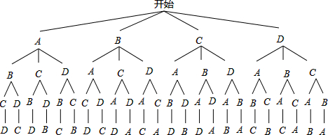 解答 解:分别用A,B,C,D表示4个同学的作业本,画树状图得:![]()