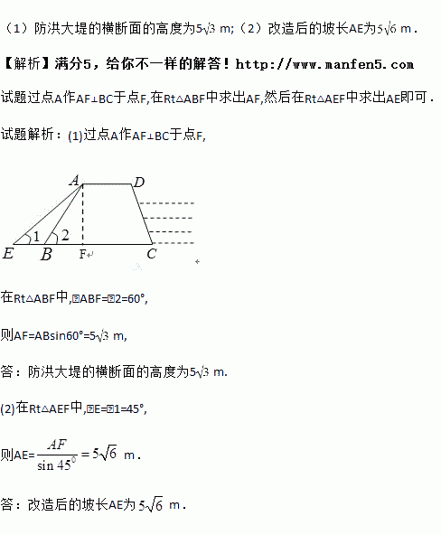如图,防洪大堤的横断面是梯形ABCD,其中AD//BC,坡长AB=10cm,坡角