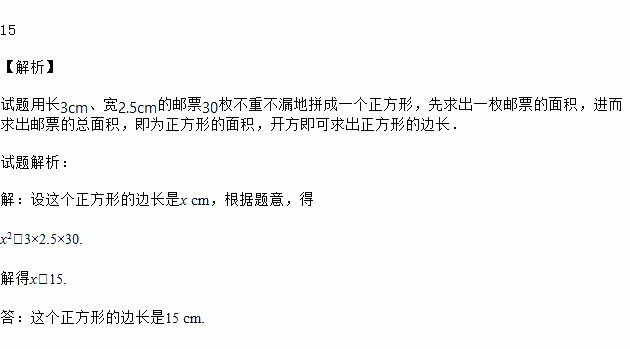 用长3cm,宽2.5cm的邮票30枚,拼成一个正方形,则这个正方形的边长是多少?