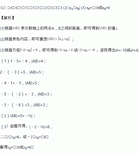 (2)观察(1)中的表格内容,猜想|AB|= ;(用含xA,xB的式子表示,不用说理)