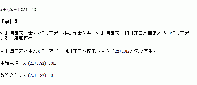 自2008年9月南水北调中线京石段应急供水工程通水以来,截至2018年5月8日5时52分,北京市累计接收河北四库来水和丹江口水库来水达50亿立方米.已知丹江口水库来水量比河北四库来水量的2倍多1.82亿立方米,求河北四库来水量.设河北四库来水量为x亿立方米,依题意,可列一元一次方程为_____.