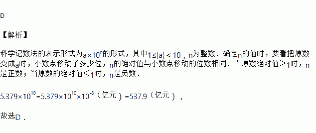 今年1月中旬以来的低温、雨雪、冰冻天气,造成全国多个地区发生不同程度的灾害,直接经济损失已达到了5.379×1010元,将此数据用亿元表示为( )