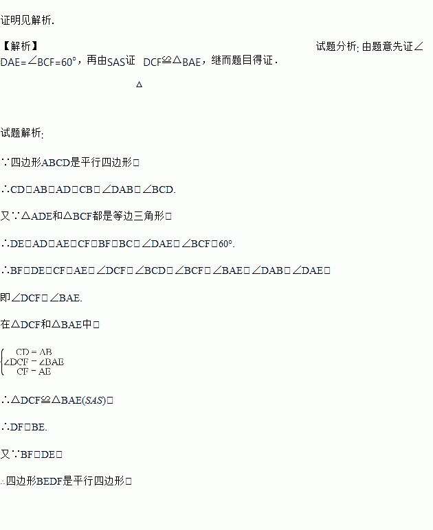 在平行四边形ABCD中,分别以AD、BC为边向内作等边△ADE和等边△BCF,连接BE、DF.求证:四边形BEDF是平行四边形.