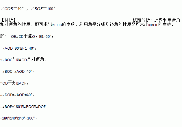 如图,直线 AB ,CD相交于点 O ,OD平分∠AOF,OE ⊥CD于点 O ,∠1=50°,求∠COB ,∠BOF的度数.