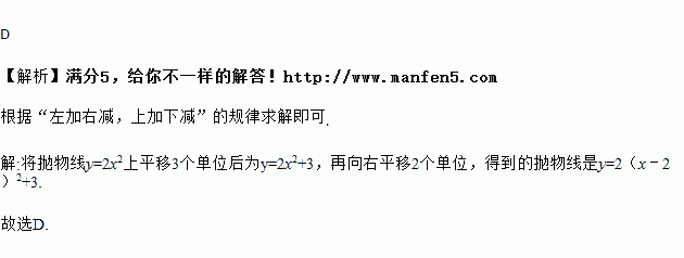 抛物线y=2x2向上平移3个单位,再向右平移2个单位,得到的抛物线是( )