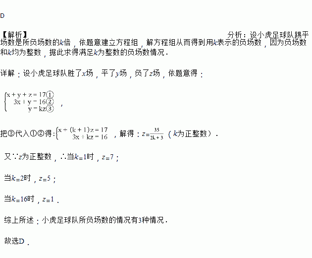今年学校举行足球联赛,共赛17轮(即每队均需参赛17场),记分办法是:胜1场得3分,平1场得1分,负1场得0分.在这次足球比赛中,小虎足球队得16分,且踢平场数是所负场数的整数倍,则小虎足球队所负场数的情况有( )种